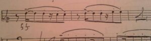 Those are two measures of the 1st clarinet part in B flat, measure 366 of the 2nd part. The actual notes are C, B flat, and D. In a rehearsal in 1977, the exact rhythm did not come out right on the 2nd violins, and Antonio would exclaim "Do-do, Co-ño… do-do, Co-ño".